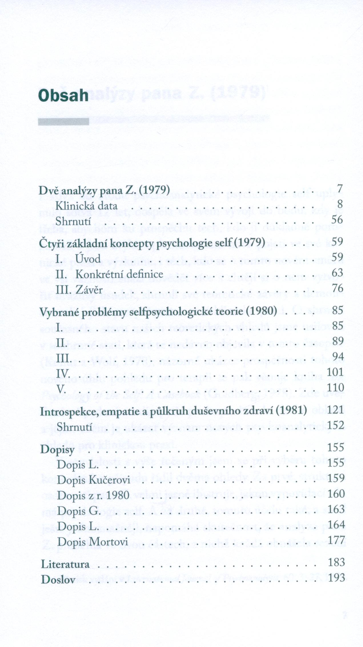 Výbor zahrnuje práce z posledních let autorova života a Kohut v nich shrnuje svou práci. Stať „Dvě analýzy pana Z.“ lze považovat za vlajkovou loď jeho přístupu a dodnes se diskutuje o tom, nakolik je pan Z. samotným autorem a jeho práce sebeanalýzou. Kohut zde na příkladu dvou dlouhodobých analýzy u jednoho muže ilustruje vlastní profesionální vývoj od tradiční psychoanalýzy k psychologii self. Publikace zároveň poskytuje přehled o základních pojmech Kohutova přístupu. Podle autora je pro jedincův vývoj zásadní kvalita vztahové zkušenosti dítěte s pečovateli a později pacienta s terapeutem. Mezi důležité prvky této zkušenosti patří empatie a zástupná introspekce. Místo relativně nezaujatého a racionálního analytika tradiční psychoanalýzy, který často interpretuje a vede pacienta k realitě, tak Kohut klade důraz na empatický, angažovaný a zrcadlící přístup, jehož cílem je, aby pacient sám sebe zakoušel jako existující, terapeutem vnímanou bytost. Poslední vybraná přednáška je pak bilancí, odkazem i poselstvím autora, který zemřel několik měsíců po jejím proslovení. Knihu doplňuje výbor z Kohutovy korespondence. V dopisech autor řadu svých myšlenek dovysvětluje z osobnějšího postoje, než je zvykem v jeho odborných pracích, a představuje své myšlenky jako proces organického vývoje směrem k intersubjektivnímu pojetí terapie.