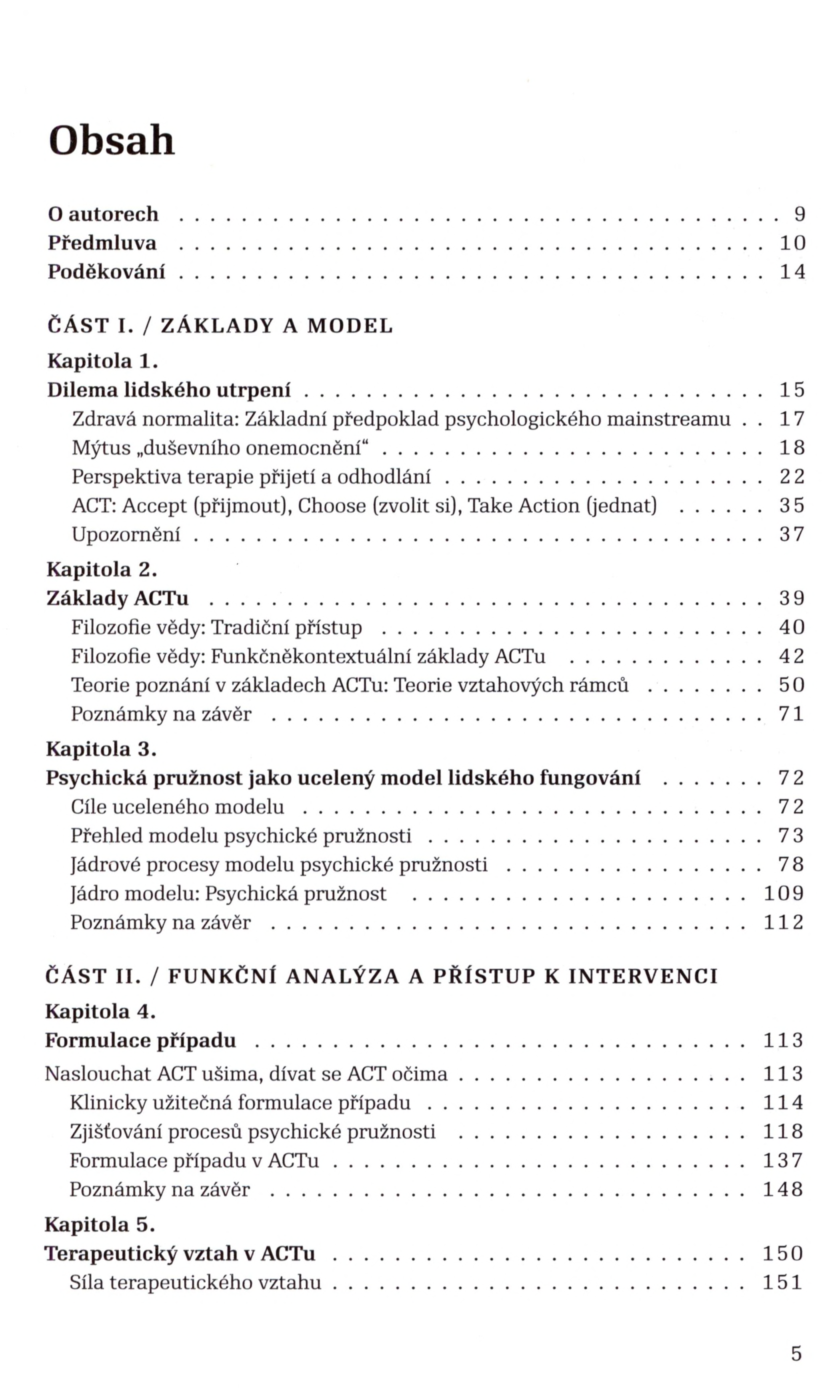 Komplexní metodologická příručka je prvním a zásadním průvodcem terapie přijetí a odhodlání (ACT) v češtině, napsaným přímo jejími původci – Stevenem C. Hayesem, Kirkem D. Strosahlem a Kellym G. Wilsonem. Od svého vydání se metoda ACT stala široce uznávaným přístupem. Tato kniha přináší její komplexní výklad: od teoretických základů po klinické techniky a zdůrazňuje význam psychologické flexibility jako klíče k překonání mnoha psychických problémů způsobených psychickou rigiditou. Autoři detailně popisují šest klíčových procesů ACT (defuze, přijetí, pozornost přítomnému okamžiku, sebeuvědomění, hodnoty a odhodlané jednání), které pomáhají psychologickou flexibilitu kultivovat. Obsahuje praktická cvičení a terapeutické dialogy, které umožňují lépe porozumět aplikaci ACT v terapii. Druhé, přepracované vydání odráží pokrok v klinických aplikacích ACT a poskytuje nové pohledy na vztahovou dynamiku. Kniha je první vlaštovkou svého druhu v češtině, která má potenciál změnit přístup k psychoterapii a zapůsobit v oblasti péče duševní zdraví.