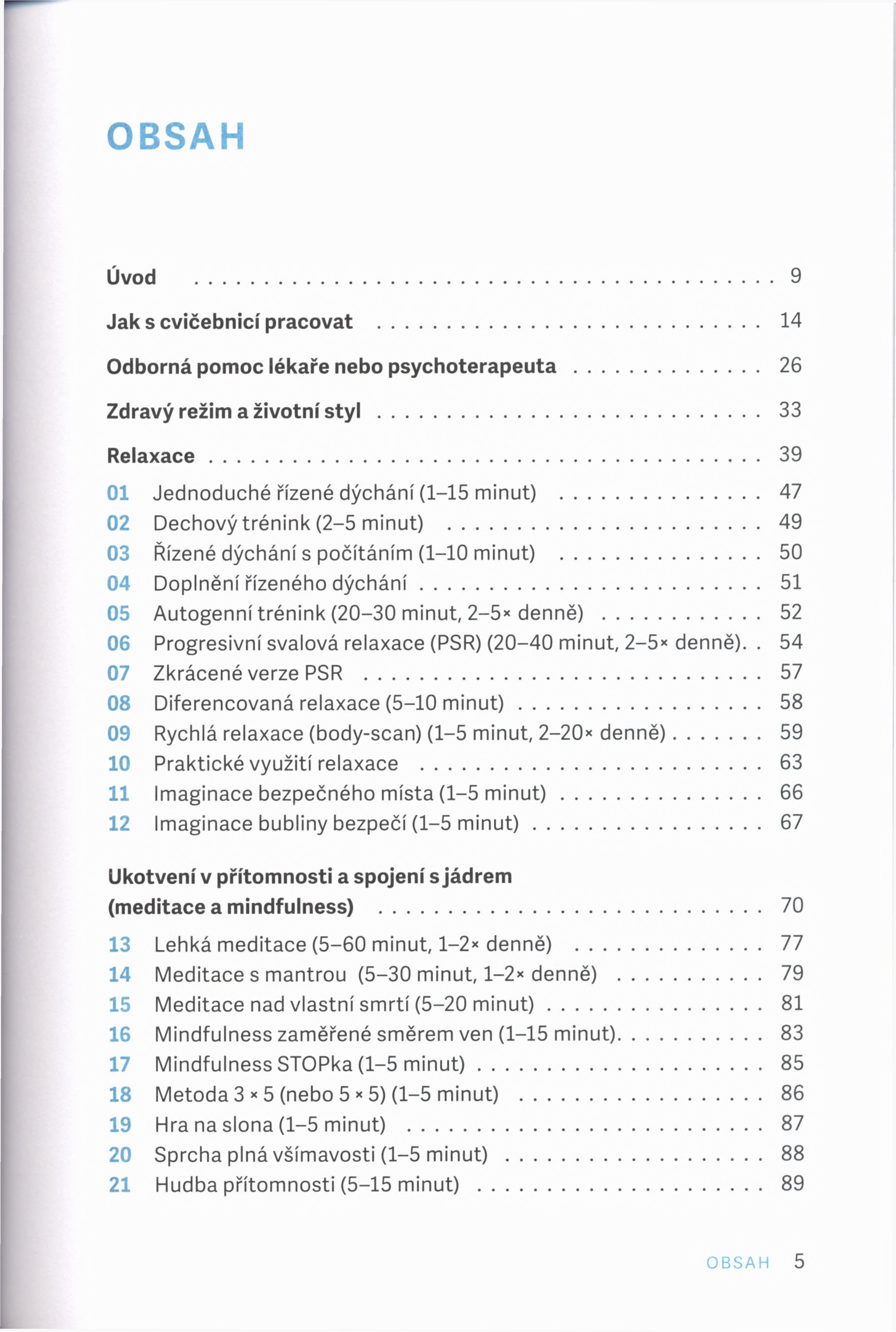 Tato cvičebnice je určena všem lidem, kteří bojují s úzkostí, ať už se projevuje obavami a strachy, negativními myšlenkami, psychosomatickými příznaky, či panickými záchvaty. K tomu, abyste zvítězili nad svými „bubáky“, potřebujete vědět, co přesně dělat, jak to dělat správně, a pochopit, proč je to důležité. Cvičebnice je rozdělena na 12 oddílů, které obsahují celkem 64 cvičení s tělem, myslí a emocemi. Každý oddíl je jako jeden pilíř mostu, po kterém budete krůček po krůčku přecházet přes rozbouřenou řeku do krajiny vnitřního klidu a duševní pohody. Oddíly cvičebnice navazují jeden na druhý, postupně si osvojíte techniky, které přinášejí úlevu od úzkosti, posílíte svou vůli a odolnost. Každým dalším cvičením zpevníte základy, které vám budou oporou na cestě k hlubšímu sebepoznání. Jednotlivá cvičení jsou doplněna pracovními listy a záznamovými archy, budete mít k dispozici podrobné návody pro práci s tělem i myslí.