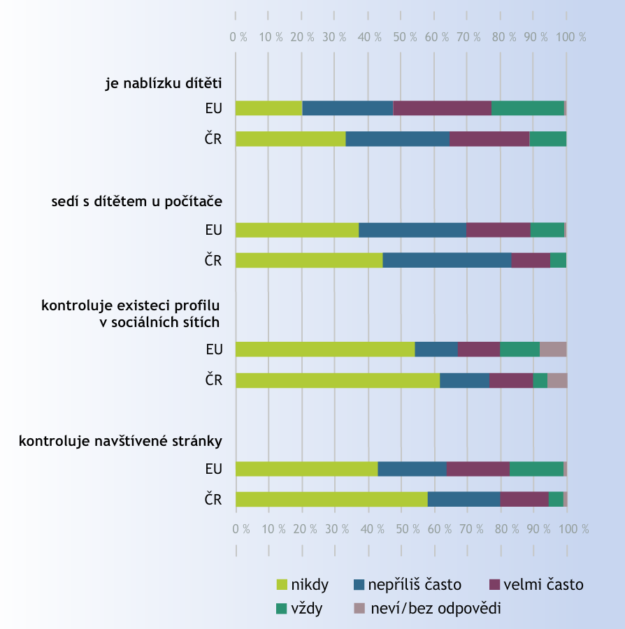 Co to znamená: Po srovnání jednotlivých kontrolních aktivit je vidět, že rodiče v Evropské unii jsou častěji nablízku svým dětem, když tráví čas na internetu (52 % rodičů tak činí velmi často nebo vždy). Ostatní strategie jsou méně časté (kontrola navštívených stránek, profilů v sociálních sítích a sezení s dítětem u počítače). Při srovnání situace v celé EU a v České republice opět vidíme, že čeští rodiče uplatňují kontrolní strategie méně často.