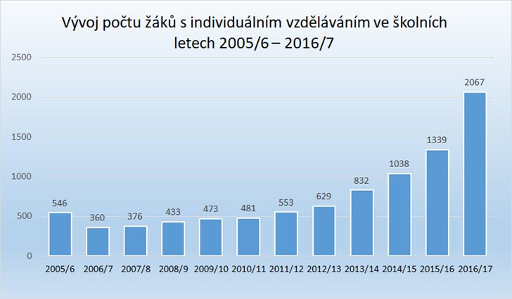 Ve školních letech 2005/6 - 2015/16 bylo individuální vzdělávání možné jen na prvním stupni základní školy, respektive v 1. až 6. ročníku ZŠ, přičemž v 6. ročníku se jednalo o jednotky dětí. Ve školním roce 2016/17 už je možné i na druhém stupni základní školy (do 10. ročníku). Z celkového počtu žáků, vyučovaných v individuálním vzdělávání, jich je ve školním roce 2016/17 na druhém stupni ZŠ (6. až 10. ročník) takto vzděláváno 449.