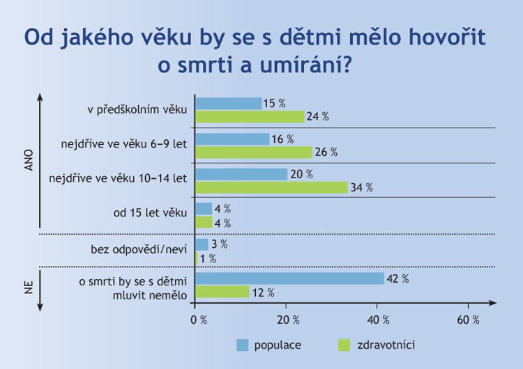 V souboru kvantitativních výzkumů Umírání a péče o nevyléčitelně nemocné pro hospicové sdružení Cesta domů se uvádí, že v rámci běžné populace je mírná většina (59 procent) pro to, s dětmi o záležitostech smrti a umírání mluvit, a to nejlépe s dětmi ve věku 10–14 let. Průzkum proběhl také mezi zdravotníky, kteří jsou častějšími zastánci toho, že s dětmi se má o tomto tématu hovořit.