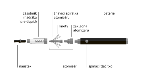 E-cigarety se obyčejně skládají z baterie (nejčastěji nabíjecí), dále atomizéru (obsahujícího topné těleso, kovovou spirálku a vatu nebo knoty), nádržky na e-liquid a náustku. Baterie přivádí proud do topného tělesa atomizéru, které zahřívá kovovou spirálku na teplotu mezi 100–250 °C. Bavlněné knoty nebo vata (dle typu zařízení) do sebe mezitím nasakují e-liquid, který je přiváděn k zahřáté kovové spirálce. Tím dochází k odpařování, fyzikálně k tzv. vaporizaci. Výsledkem je aerosol (pára) připomínající kouř. Ve srovnání s klasickými zápalnými cigaretami se tedy v e-cigaretách nic nespaluje, nehoří ani se do nich nevkládá tabák.